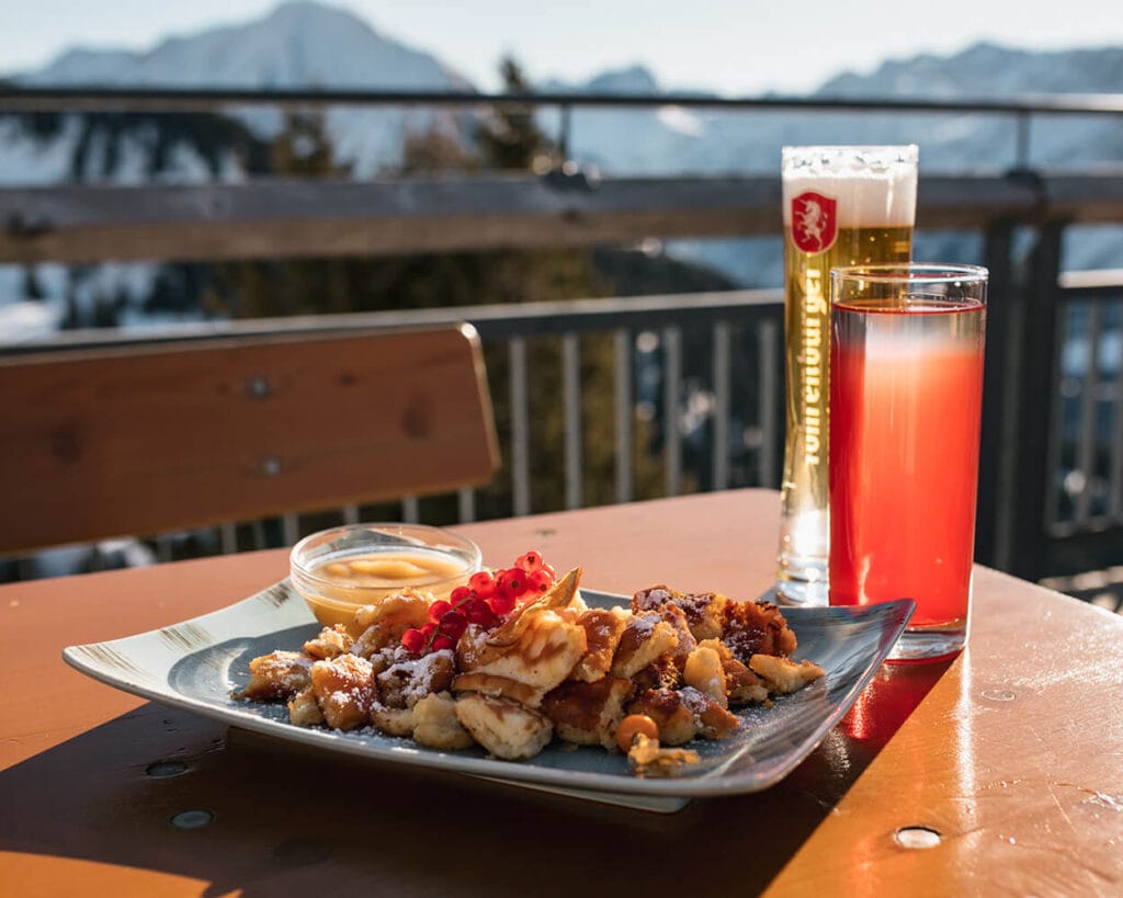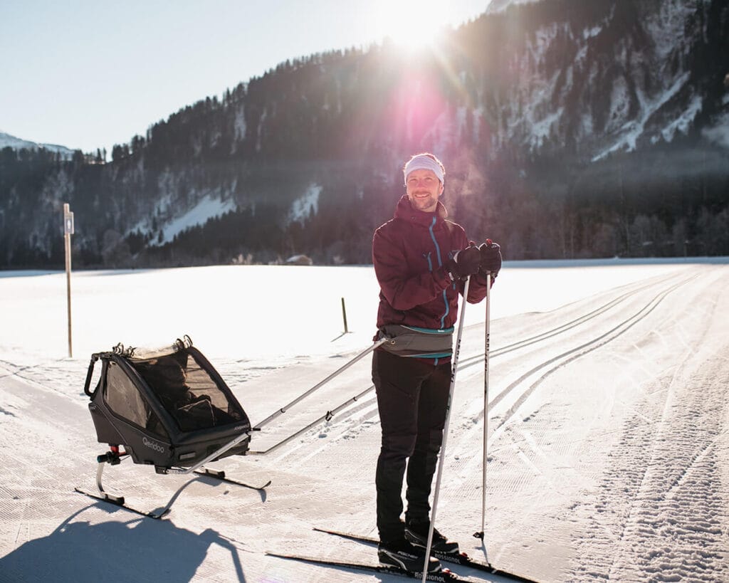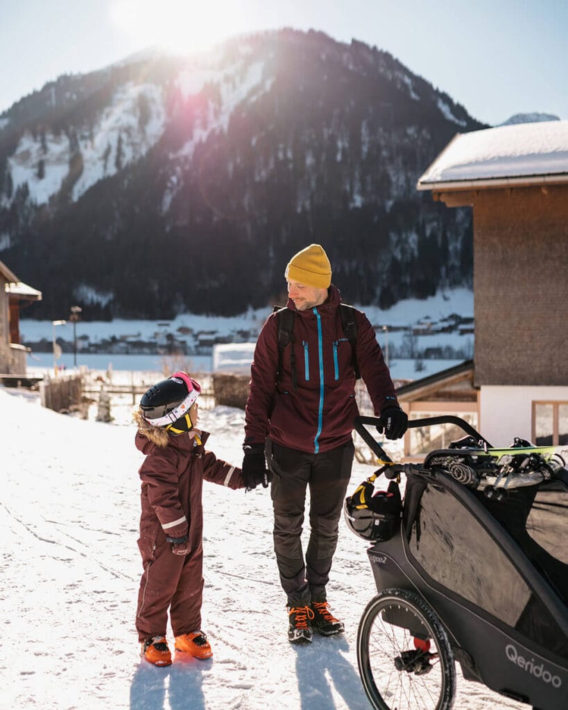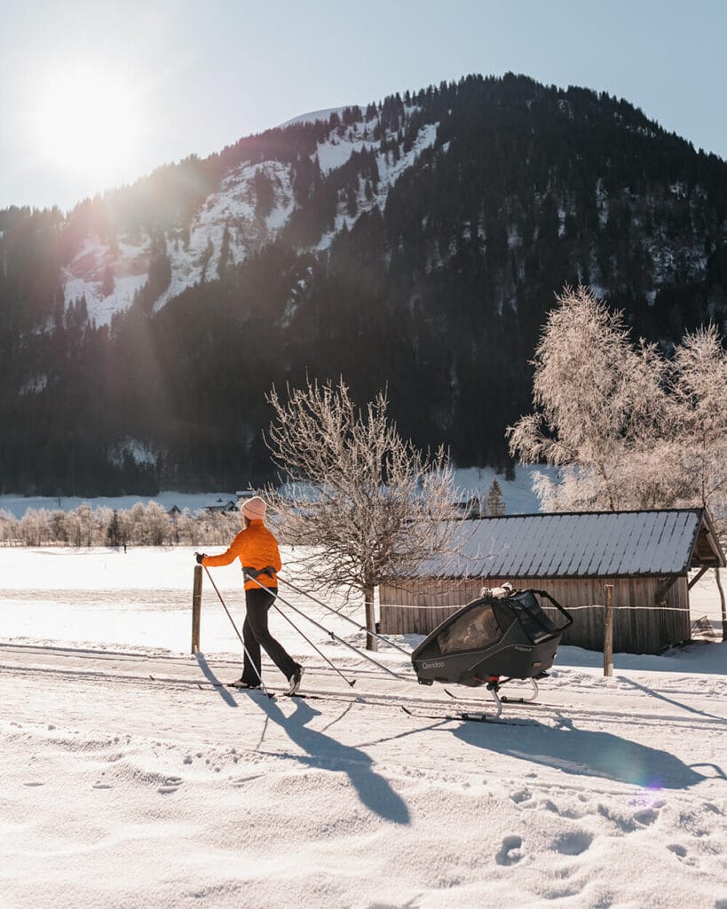 Während die Kinder im umgebauten Fahrradanhänger mit Kuffen entspannt die Aussicht genießen, schlittern wir noch recht wackelig auf der Loipe über die verschneiten Hügel, die uns eine atemberaubende Ausblicke auf die umliegenden Berge ermöglichen. Die ruhige Atmosphäre und die klare Bergluft lässt uns alle Anstrengung im Nu vergessen. Nach dem sportlichen Vormittag gönnen wir uns im gemütliche s’Frie Café ein heißes Getränk zum Aufwärmen, während die Kinder fröhlich von ihrem Tag erzählen.