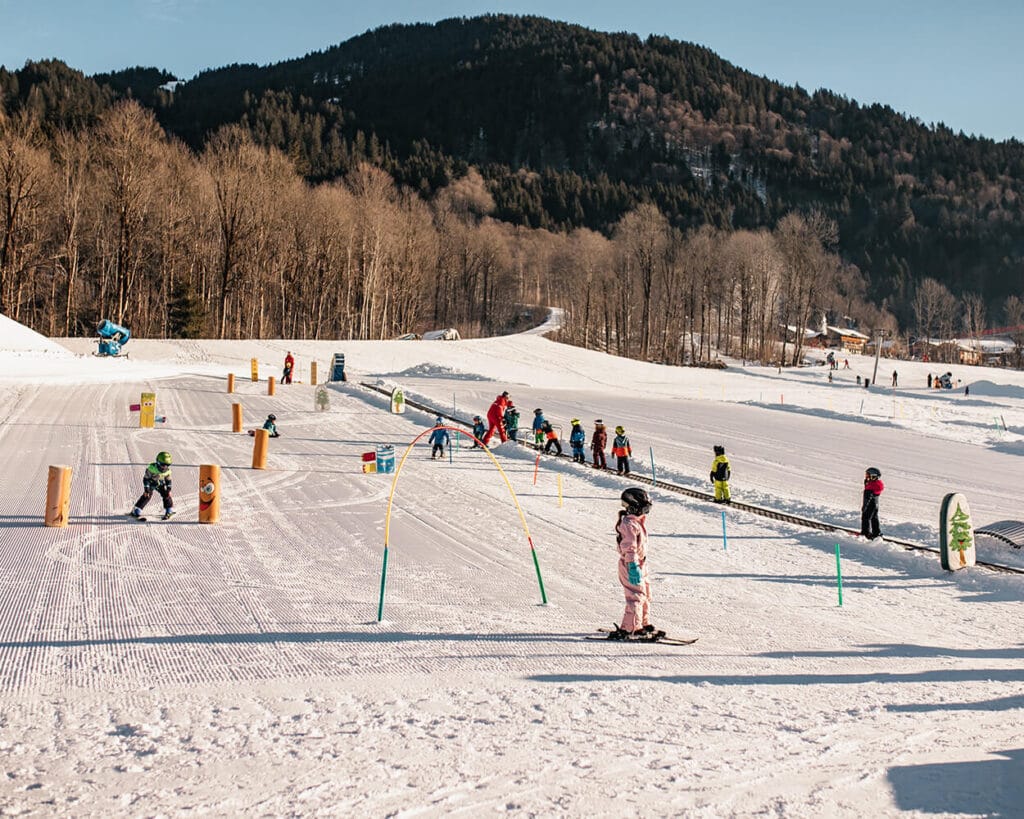 Die Gruppen sind nach Alter und Skierfahrung eingeteilt, sodass jedes Kind individuell gefördert wird. Der Unterricht findet jeweils vormittags für zwei Stunden und nachmittags erneut für zwei Stunden statt. Eltern können entspannt am Rand der Skischule zusehen oder die optionale Mittags-Kinderbetreuung nutzen, um selbst etwas zu unternehmen. Für fortgeschrittene kleine Pistenflitzer gibt es spannende Abenteuer, wie erste Versuche im Tiefschnee, Buckelpisten oder kleine Rennstrecken zum Ausprobieren.