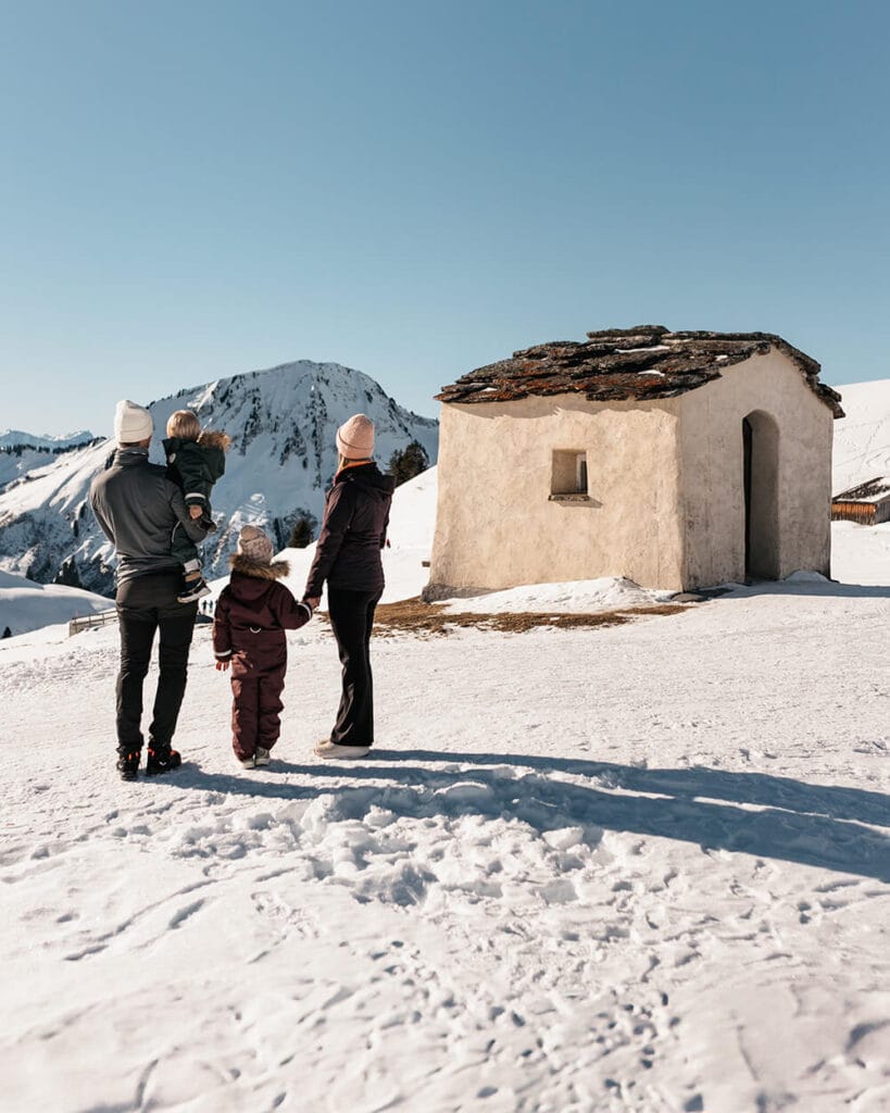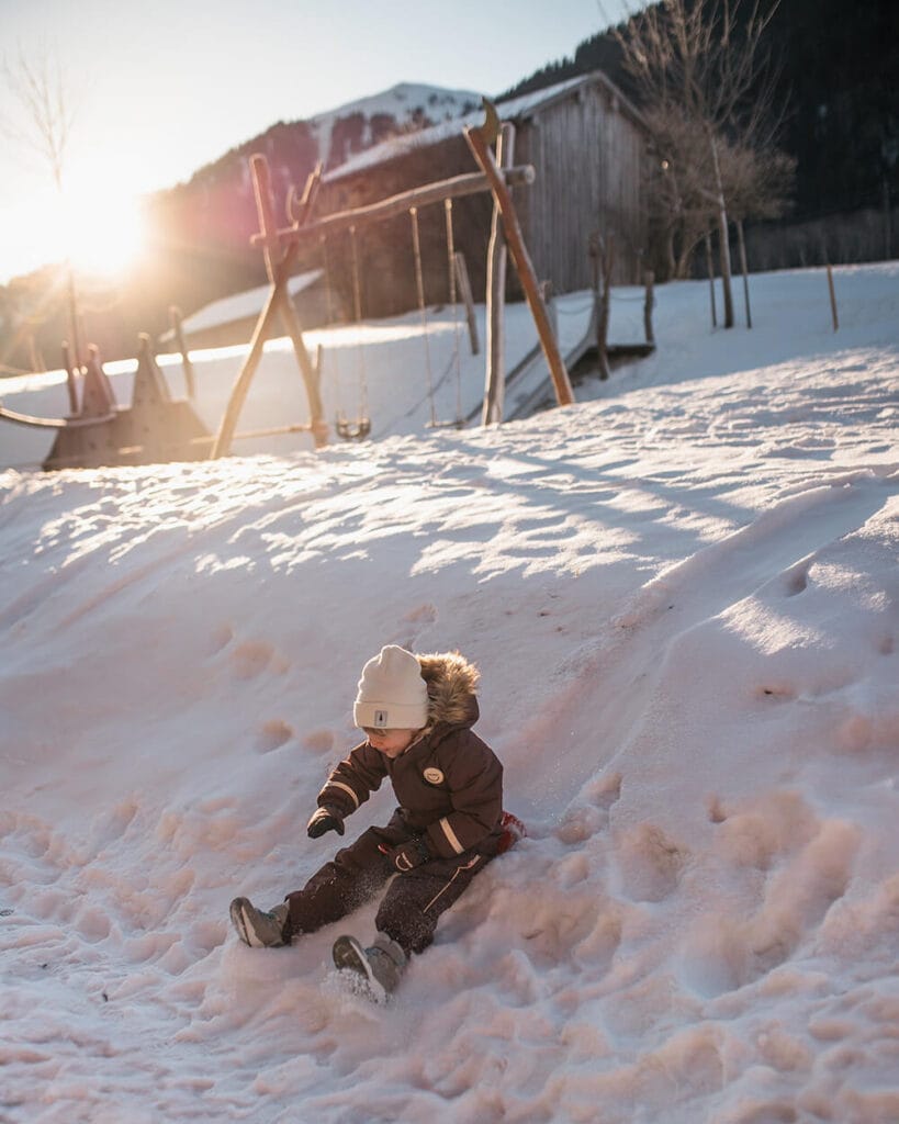 Natürlich bliebt unser kleiner Schneehase auch nicht untätig! Während seine große Schwester Tag für Tag besser auf den Brettern steht, erkunden wir mit ihm zusammen die verschneiten Winterwanderwege rund um Schoppernau. Dick eingepackt stapft er begeistert durch den frischen Pulverschnee, baut Schneemänner und lacht vergnügt, als wir ihn auf dem Schlitten durch die weiße Landschaft ziehen.